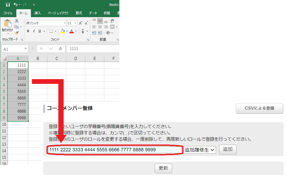 Excel上にあるユーザの学籍番号(学生の場合)あるいはUTID-NAME(教職員の場合)をコピーし,コースメンバー登録画面でペーストした場合も登録することができます.ペースト時に半角スペースが挿入され,半角スペースで区切って入力した状態になるためです.