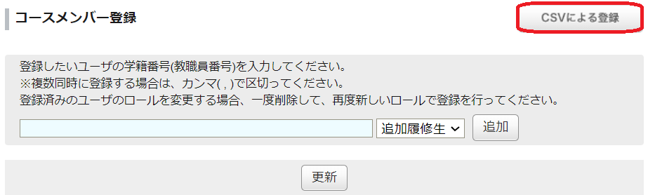 - (1)コースメンバー登録(登録するコースのトップページ右上にある「コース設定」ボタンを押し,「コースメンバー登録」をクリック)画面右側にある「CSVによる登録」ボタンをクリックします.